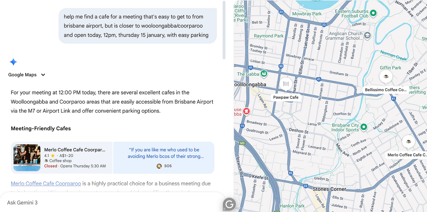 ✅ Ask for a cafe with shade, near water, that takes bookings, isn’t busy between 8-10am, and is on the way to your next meeting. That’s when AI moves from search engine to your personal concierge.
