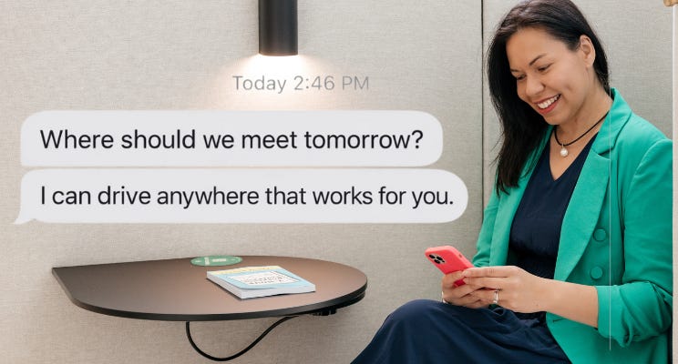 It’s a client: “Where should we meet tomorrow? I can drive anywhere that works for you.”